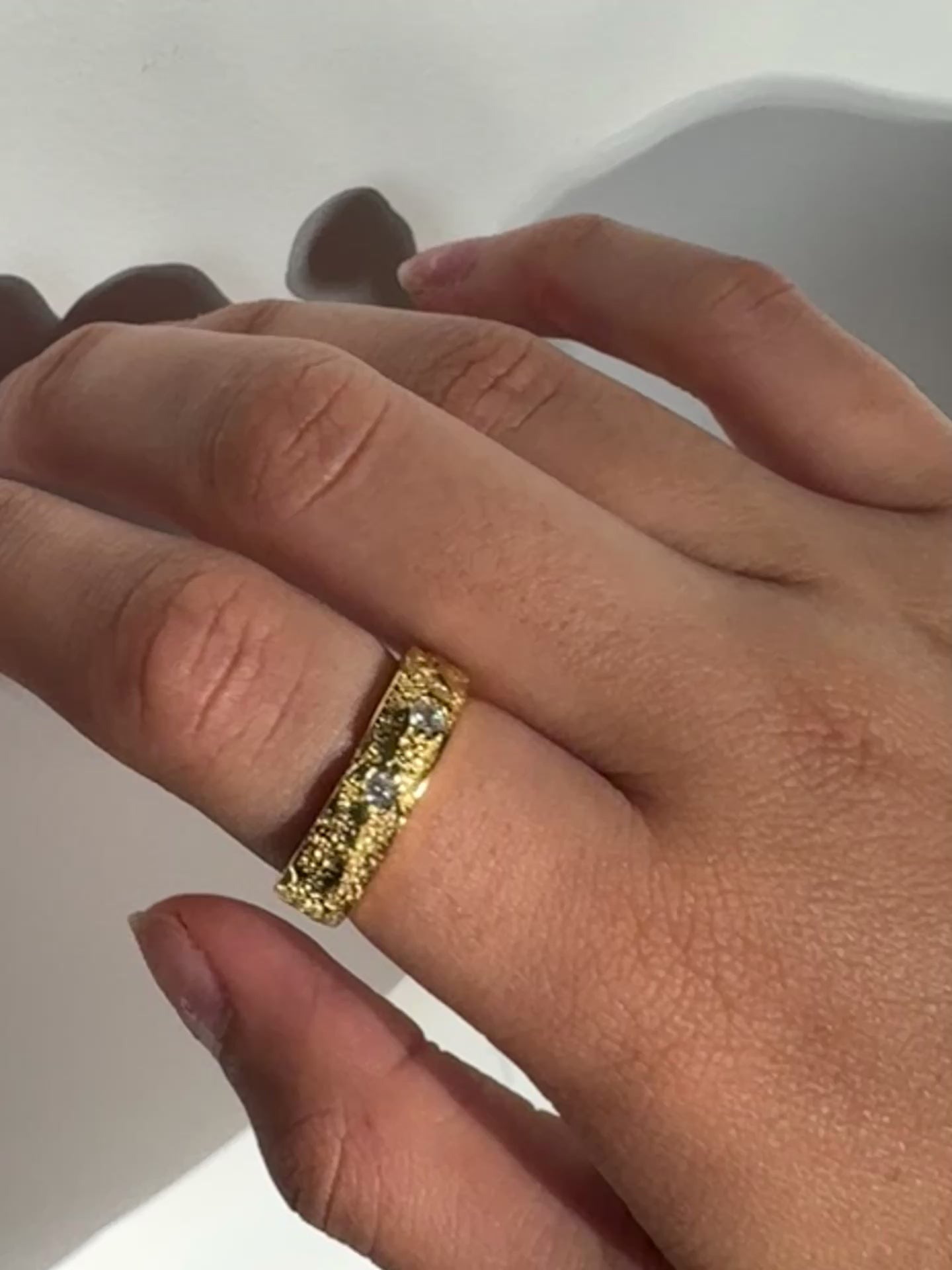 Crafted from 925 sterling silver and featuring an intricate texture resembling the surface of the moon, this beautiful ring is also available with 18k gold plating and features two glistening cubic zirconia stone accents. Shine bright like the moon and capture the heavenly beauty of Luna.